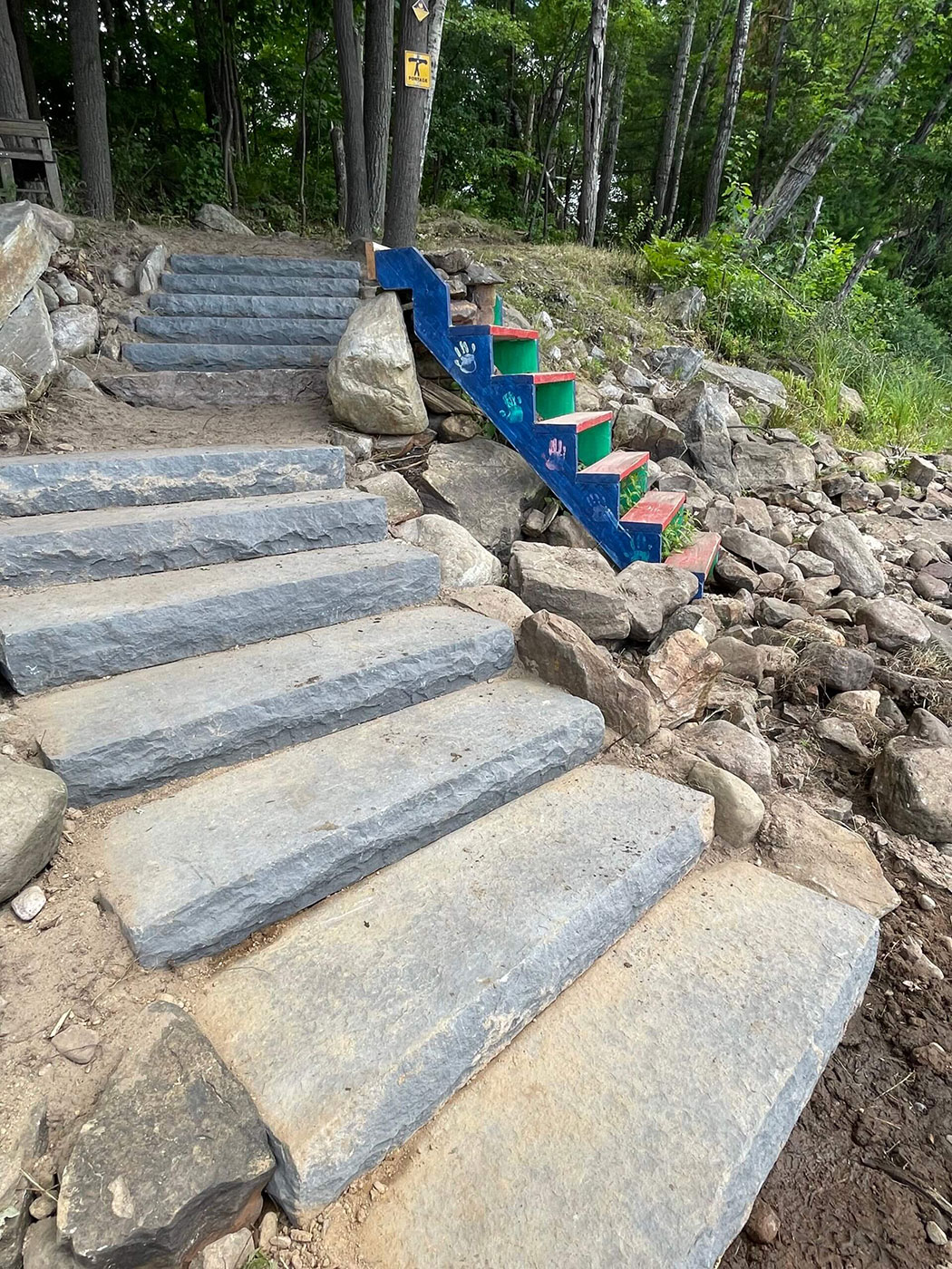 The Kent Falls project updated and modified trail infrastructure around a series of NYSEG dams. The work included constructing a 12-step stone staircase at the upstream take-out, establishing a new portage trail, constructing a small boardwalk and upgrading a put-in at the end of the portage.